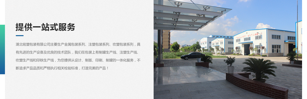 湖北銘塑包裝有限公司一家集研發(fā)、生產(chǎn)、銷售于一體的較優(yōu)秀民營企業(yè),技術(shù)力量雄厚,產(chǎn)品質(zhì)量可靠。位于交通暢順,百業(yè)興旺、經(jīng)濟富裕、政策開放的孝感開發(fā)區(qū)域。我們企業(yè)的營銷戰(zhàn)略是以建筑為土壤,以產(chǎn)品為種子,以質(zhì)量為肥料,讓綠色鋪滿全球。憑借多年來的行業(yè)經(jīng)驗,公司不斷進行創(chuàng)新和研發(fā),為市場提供更廣泛的產(chǎn)品應(yīng)用領(lǐng)域和更好環(huán)保節(jié)能產(chǎn)品,為國家能源環(huán)保戰(zhàn)略和可持續(xù)發(fā)展戰(zhàn)略作出應(yīng)有的貢獻(xiàn)。 湖北銘塑包裝有限公司主要生產(chǎn)金屬包裝系列、注塑包裝系列、吹塑包裝系列,具有先進的生產(chǎn)設(shè)備及優(yōu)良的技術(shù)團隊,我們在包裝上有制罐生產(chǎn)線、注塑生產(chǎn)線、吹塑生產(chǎn)線和印鐵生產(chǎn)線,為您提供從設(shè)計、制版、印刷、制罐的一體化服務(wù),不斷追求產(chǎn)品品質(zhì)和嚴(yán)格執(zhí)行相關(guān)檢驗標(biāo)準(zhǔn),打造更好的產(chǎn)品!